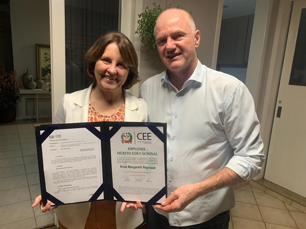 A secretária de educação, ciência e tecnologia de Içara, professora Rose Reynaud, recebe nesta segunda-feira, dia 18, o Diploma de Mérito Educacional. A honraria é entregue pelo Conselho Estadual de Educação para profissionais com relevantes serviços prestados na área em todo território catarinense. A indicação foi feita pelo ex-reitor da Unesc, conselheiro Gildo Volpato e aprovada por todo conselho no último dia 28 de setembro. Embora a entrega solene ocorra nesta segunda-feira, às 17 horas, de maneira virtual, Rose já recebeu o quadro com o título das mãos de Volpato durante este fim de semana.