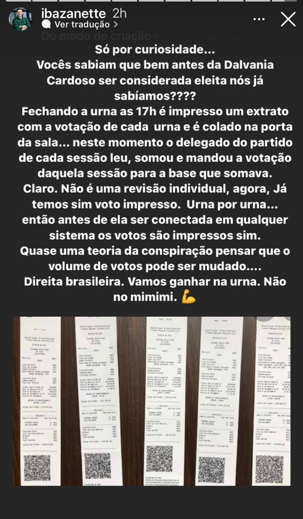 Na postagem que fez em suas redes sociais, Ibanez, que é também o presidente da Fundação de Meio Ambiente em Içara, citou o extrato de cada urna e o comparou ao voto impresso. “Já temos sim o voto impresso”, enfatizou. “Quase uma teoria da conspiração pensar que volume de votos pode ser mudado. Direita brasileira, vamos ganhar na urna, não no mimimi”, enfatiza em seu post.