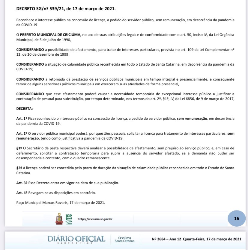 O prefeito de Criciúma, Clésio Salvaro, do PSDB, publicou decreto hoje que libera os servidores públicos municipais do serviço em razão da pandemia de Covid 19, mas sem remuneração. ” Estou decretando lockdown na prefeitura, voluntário, facultativo, só não vai ter salário”, disse o prefeito em vídeo publicado nas redes sociais.