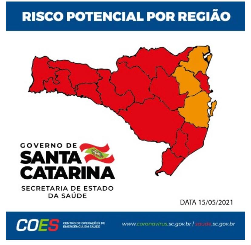 A matriz de risco potencial divulgada neste sábado pela Secretaria Estadual de Saúde aponta somente três regiões de Santa Catarina classificadas como graves, cor laranja. Todas as demais localidades são de cor vermelha, ou seja, gravíssimo.