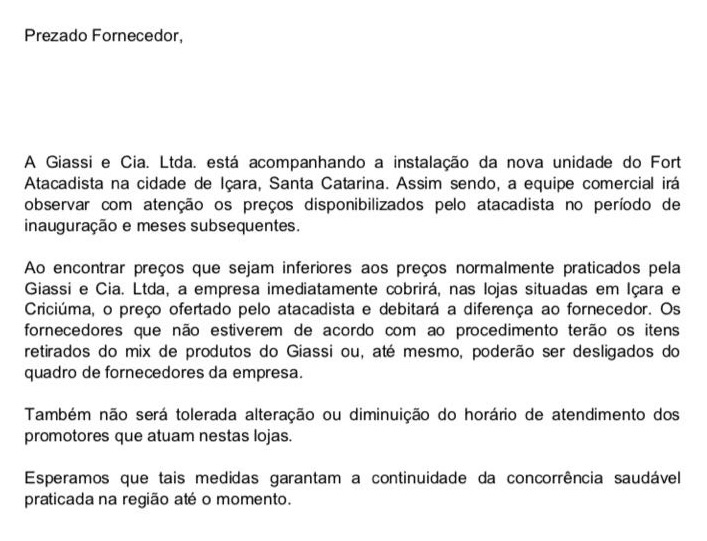A carta que gestores da rede Giassi Supermercados enviaram aos fornecedores, comunicando a ‘fiscalização’dos preços do Fort Atacadista, a ser inaugurado em Içara no dia 2 de agosto, vazou nas […]
